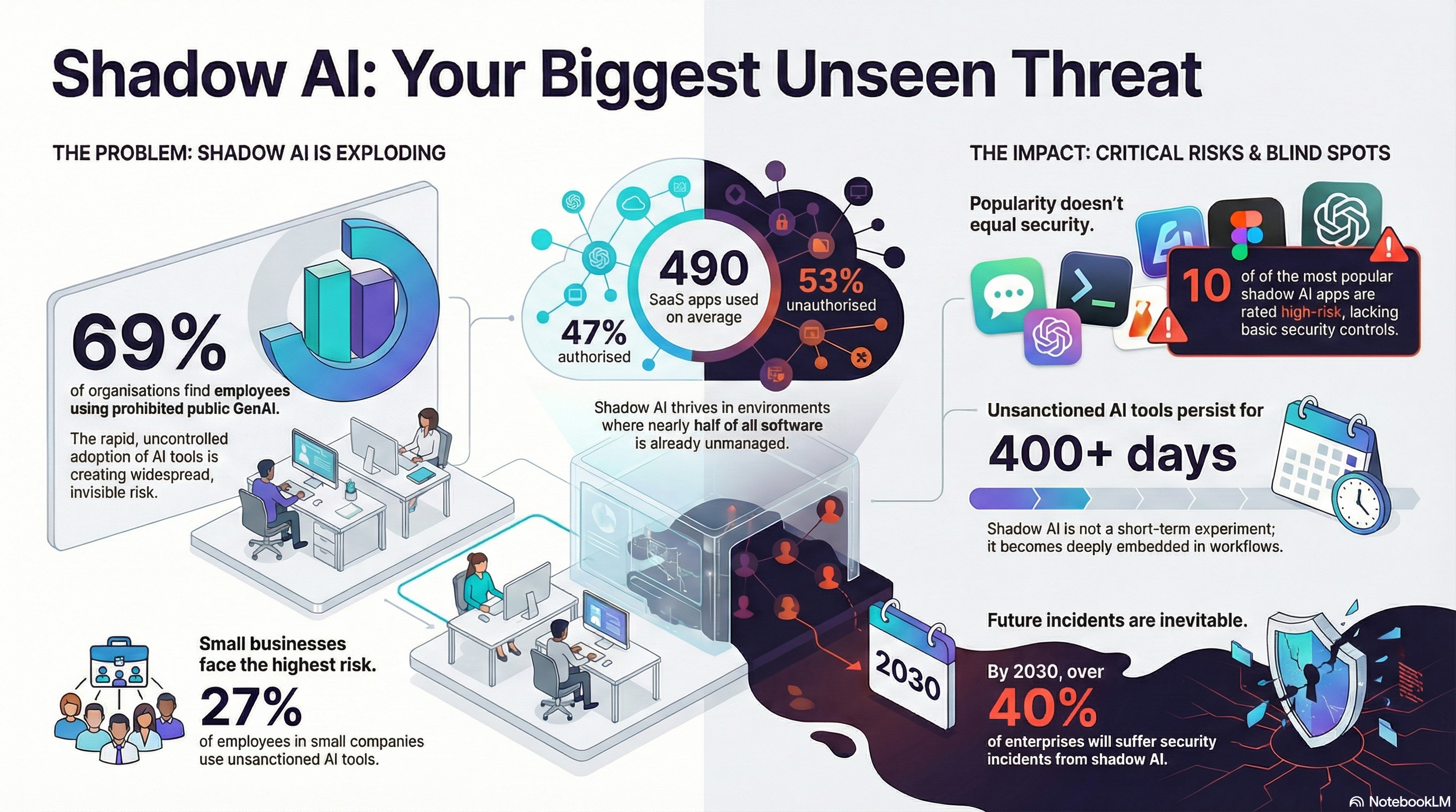 在現代企業環境中,「影子 SaaS」(Shadow SaaS) 已從微小的 IT 煩惱轉變為主要的安全挑戰。最新數據顯示,企業平均管理 490 個 SaaS 應用程式,但令人震驚的是,其中 53% 未經 IT 部門授權或核准。這種擴張創造了一個環境,員工為了提高效率而採用各種工具——從專案管理到生成式 AI——卻未經過正式的安全審查,往往讓組織對巨大的數據洩露風險視而不見。忽視這些隱藏風險代價高昂,影子 AI 程度較高的公司面臨的數據洩露平均成本達 670,000 美元。