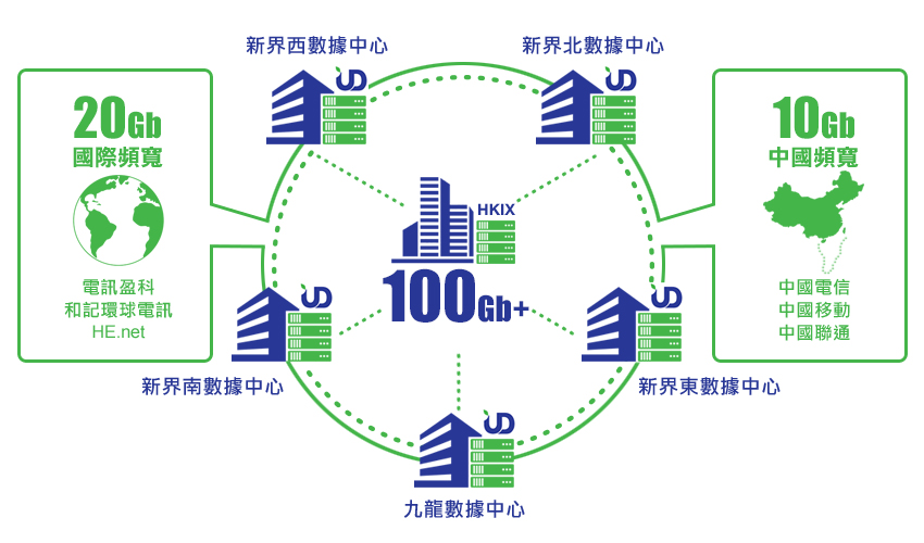 100Gb+ 的本地頻寬配合環狀網絡架構貫穿五大數據中心,令我們能為客戶提供更優質的服務,未來我們將有更多突破,請大家拭目以待!